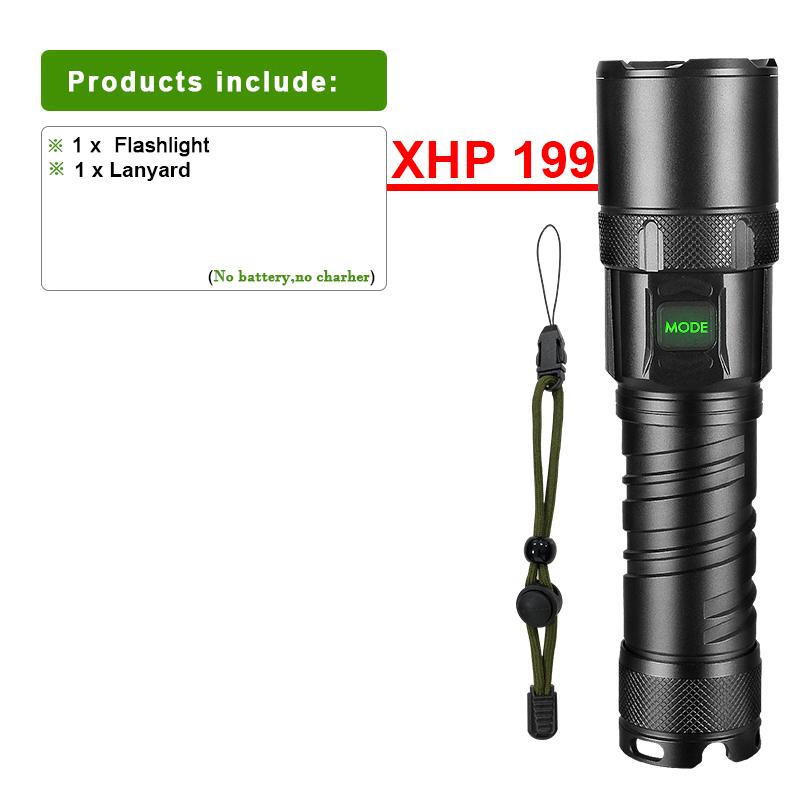 XHP199 Светодиодный фонарик высокой мощности Водонепроницаемый фонарик с зумом Вспышка 26650 Батарея Ручной фонарь Походный фонарь no battery чёрный