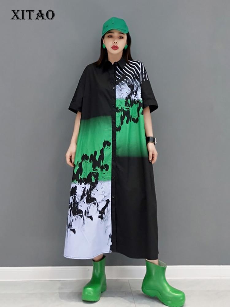 XITAO повседневное платье-рубашка с принтом, асимметричное, контрастное, простое, с отложным воротником, женское, новое, летнее, WMD4675