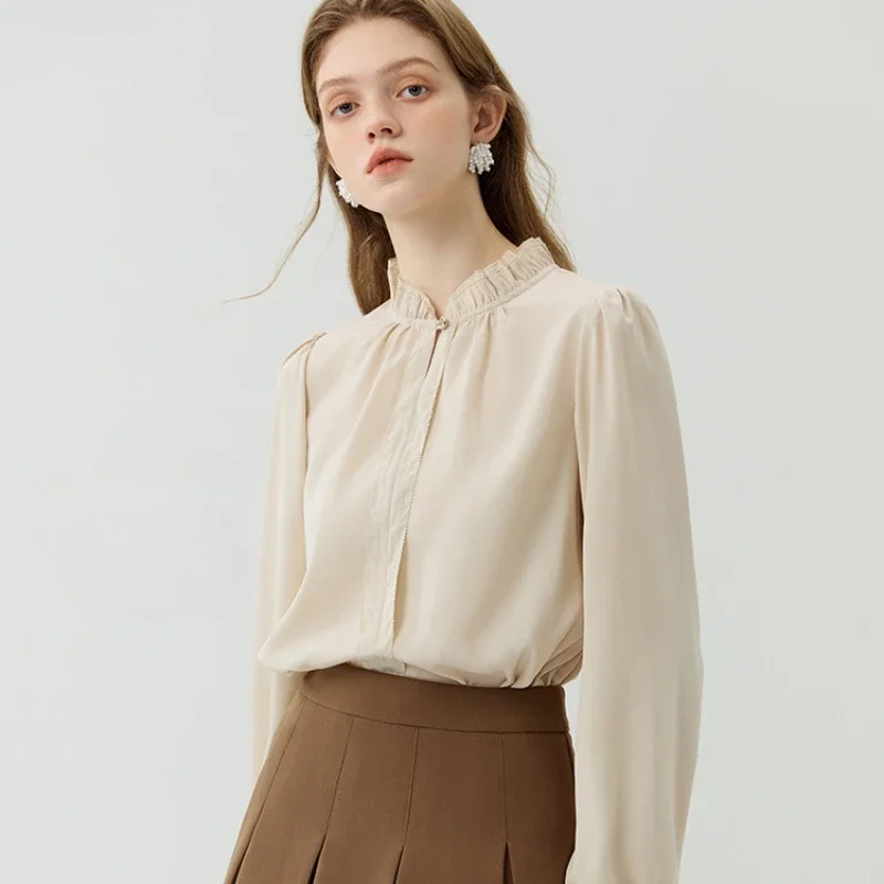 Шифоновая винтажная женская рубашка свободные Однотонные блузки модная одежда с длинными рукавами весенне-летние женские топы с оборками YCMYUNYAN