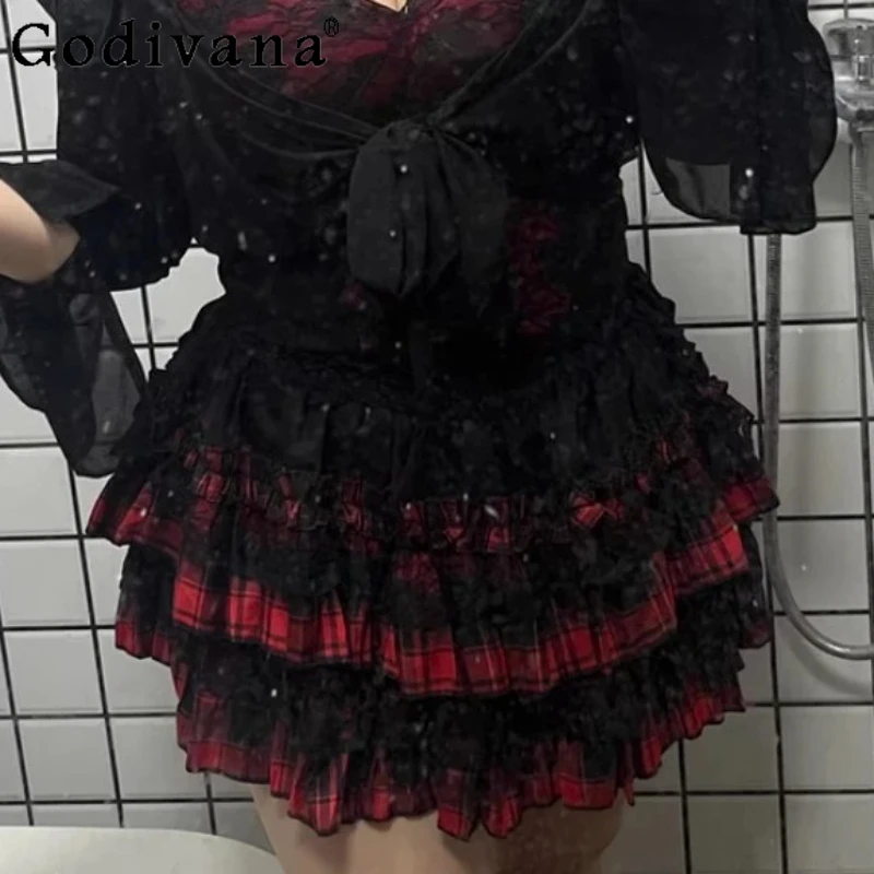 Y2k Sweet Cool Сексуальная Личность Панк Черная Красная Клетчатая Юбка Мода Кружевной Торт Универсальные Возрастные Короткие Юбки Принцессы