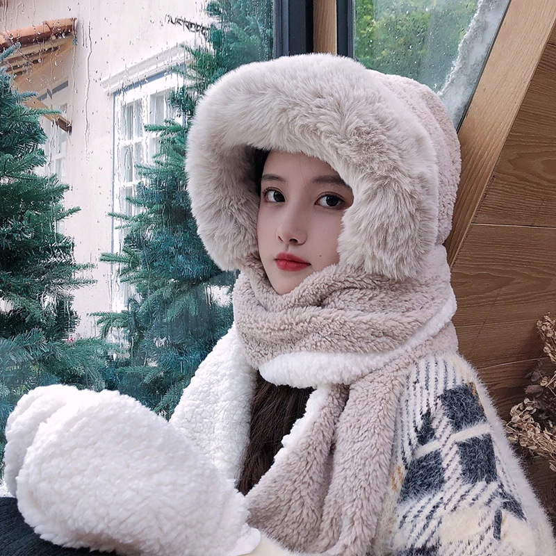 2022 зимние женские крышки-новинки теплая Милая шапка Повседневная плюшевая шапка шарф перчатки Комплект из трех частей Повседневная одното...