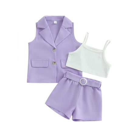 Sunisery 3Pcs Little Girls Summer Vest Shorts Outfits Sleeveless Blazer + Cami Tops + Shorts Set Kids Suits Purple 4-5 Years