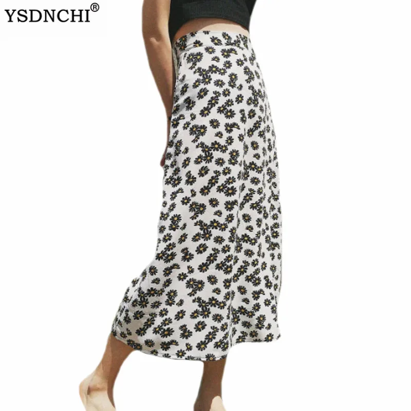 YSDNCHI, винтажная Длинная летняя юбка с цветочным принтом и оборками, Женская белая уличная черная юбка средней длины из полиэстера на молнии