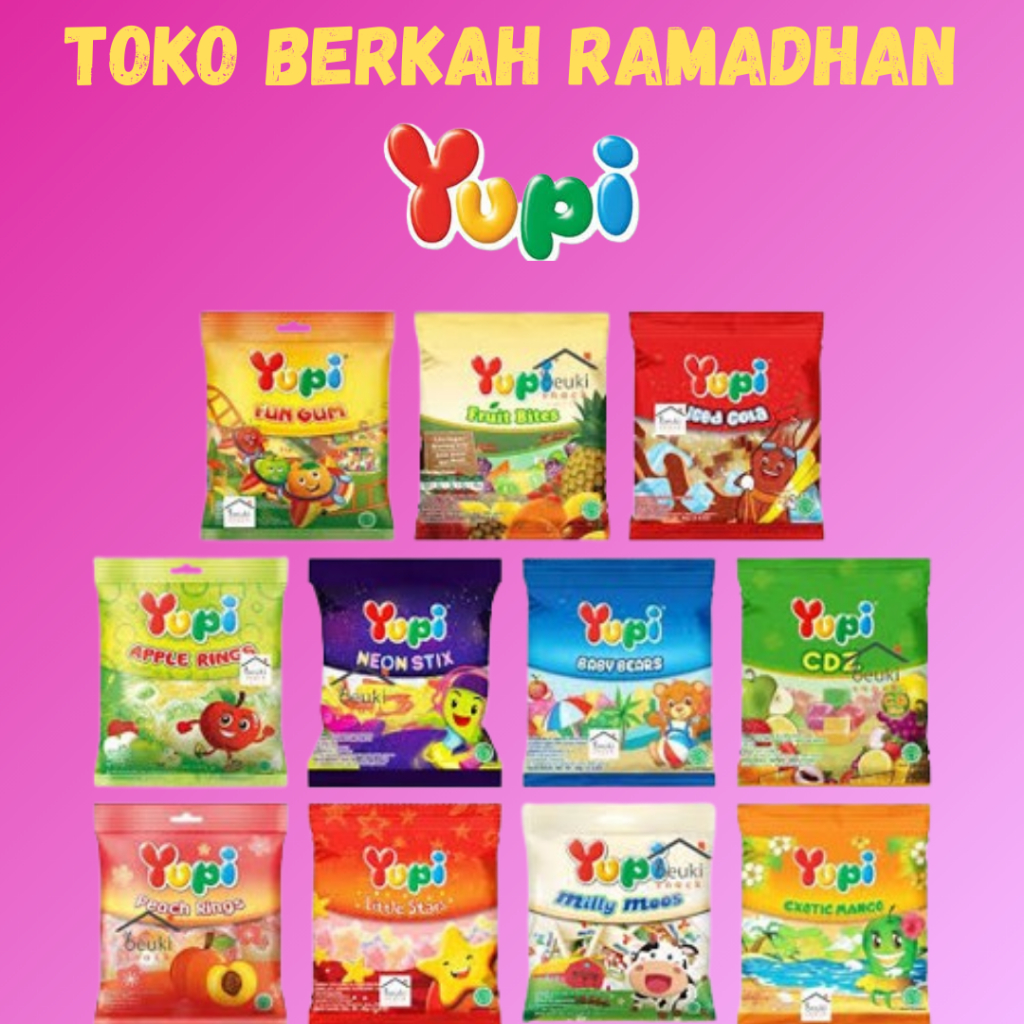 Permen Yupi, berupa permen lunak jeli bulat dengan rasa buah. Permen ini dirasa begitu berbeda dan spesial sesuai tema yang diusung, dalam setiap pcsnya menggunakan bahan jus buah 20% dari seluruh komposisinya. Jadi permen ini akan terasa banget rasa buahnya sesuai varian yg ada. Yupi Bolicious: Permen lunak jeli bulat dengan rasa buah yang menggunakan bahan jus buah 20% dari seluruh komposisinya. Yupi Bolicious juga mengandung kolagen yang dapat membantu meningkatkan kelembapan kulit, meningkatkan elastisitas kulit, dan membantu mengurangi kerutan pada kulit.