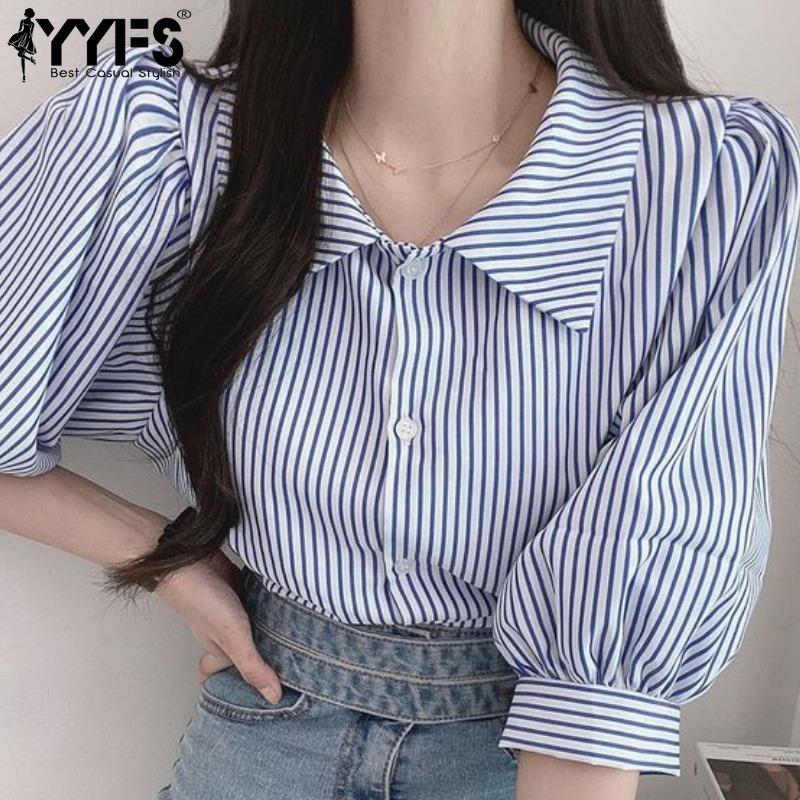 YYFS Женская мода Повседневная Лето Весна Полосатый Принт Короткий рукав Воротник ПОЛО Блузки и Рубашки S