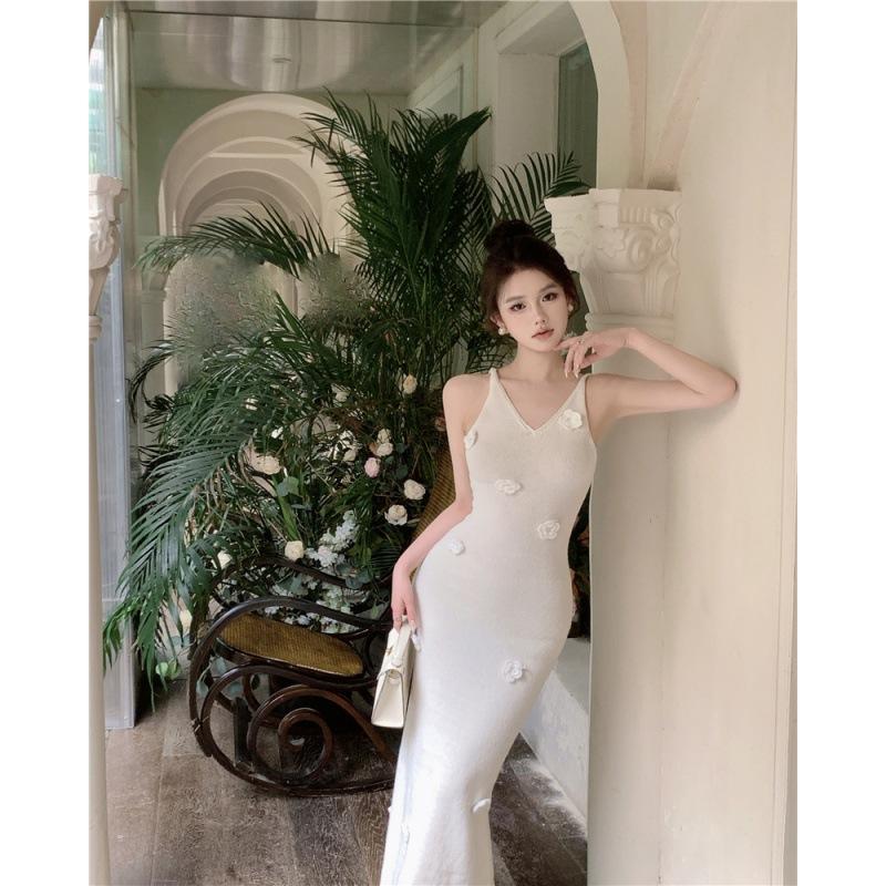YYFS Женская мода лето весна однотонный принт без рукавов V-образный вырез высокая талия повседневные платья Size: One Size
