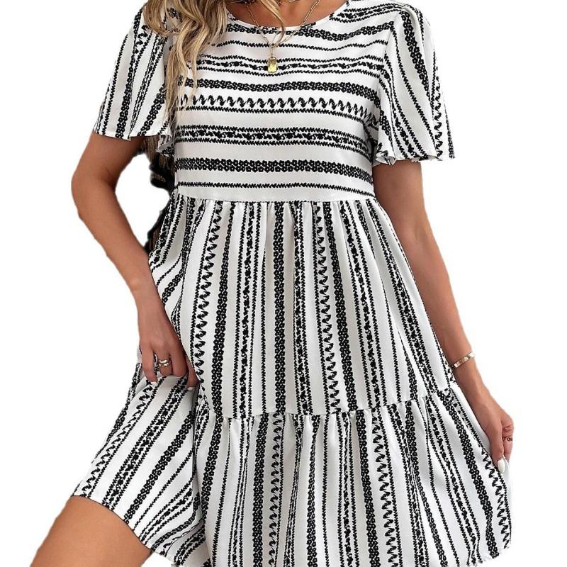 YYFS Женская мода лето весна полосатый принт короткий рукав О-образный вырез средняя талия повседневные платья XXL