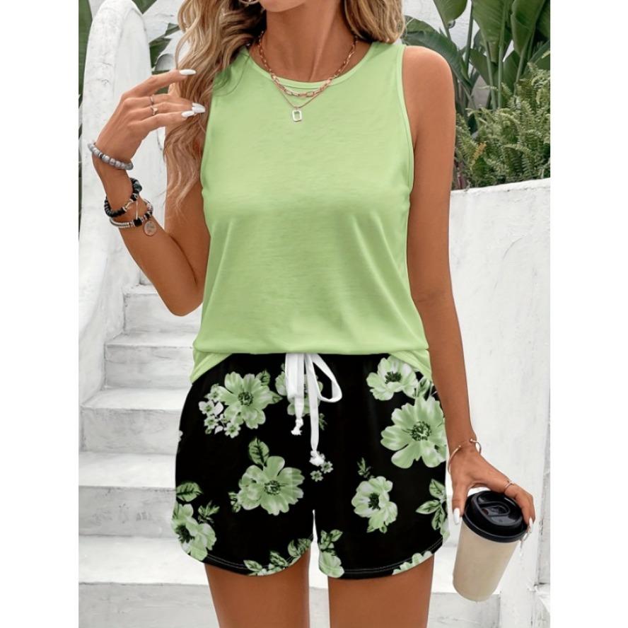YYFS Женская мода повседневная летняя весенняя цветочная безрукавка с круглым вырезом брюки костюмы S
