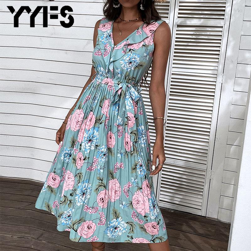 YYFS Синий лотос Цветок Женщины Весна Лето Мода Без рукавов V Шея Середина икры Повседневные платья
