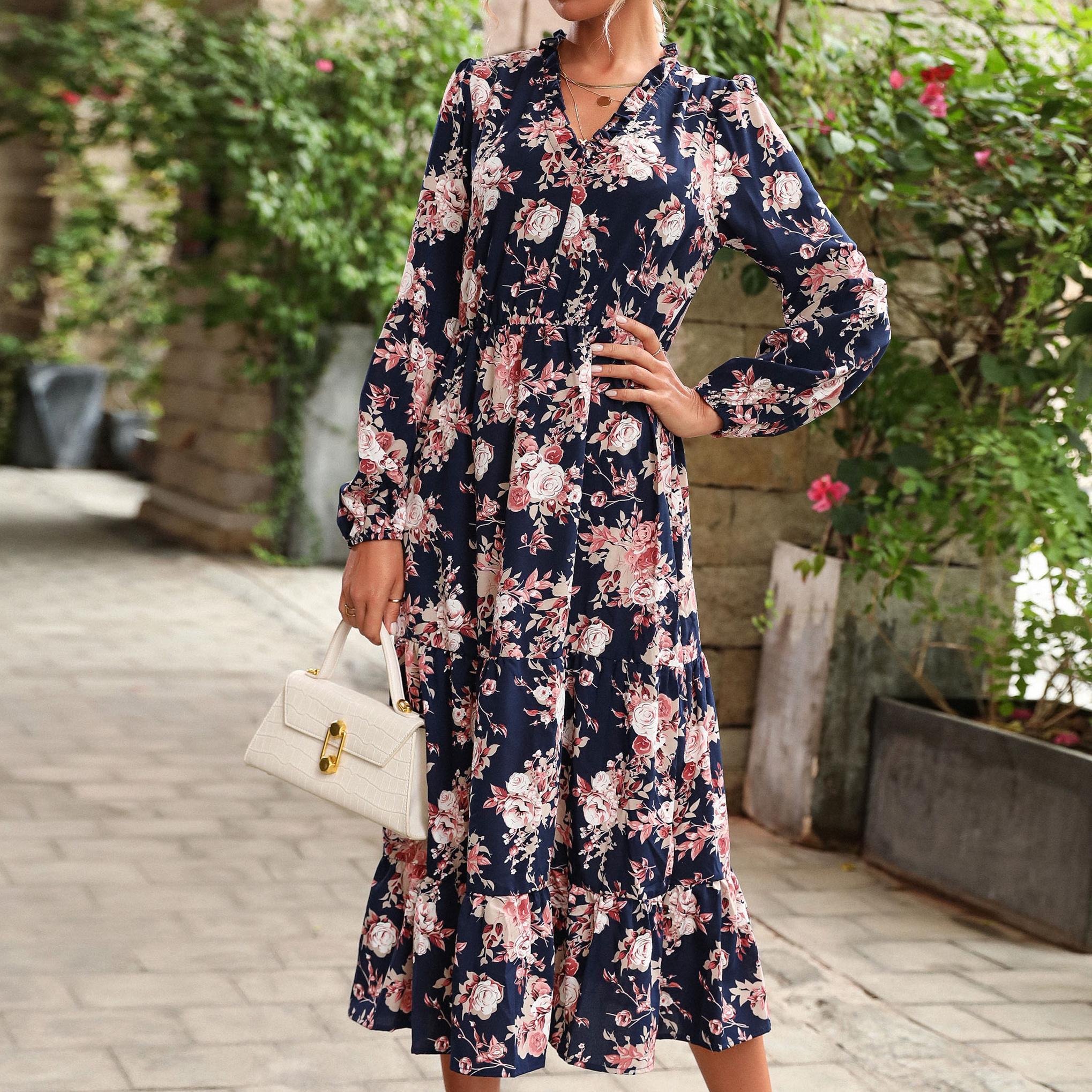 YYFS женские модные летние весенние повседневные платья с длинным рукавом и v-образным вырезом и высокой талией с цветочным принтом XL темно-синий