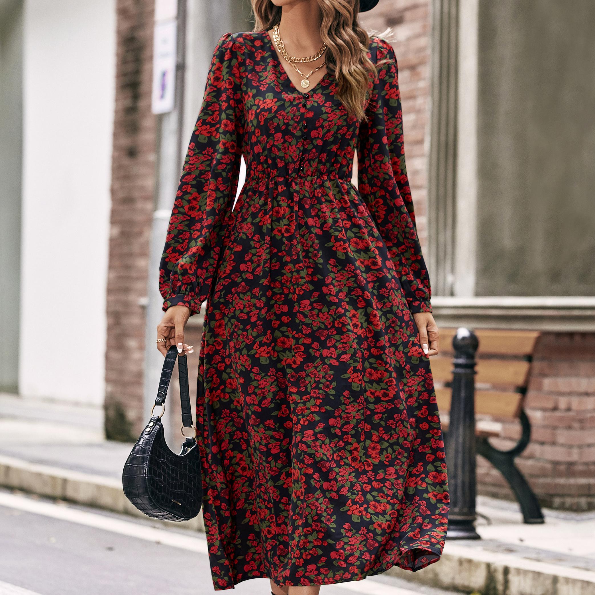 YYFS женские модные летние весенние повседневные платья с длинным рукавом и v-образным вырезом и высокой талией с цветочным принтом XS чёрный