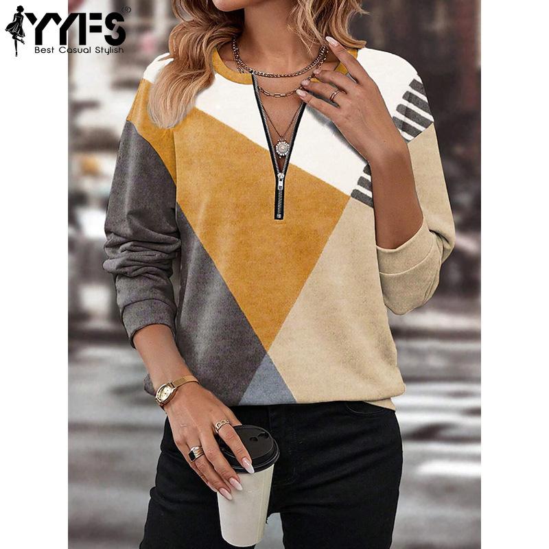 YYFS женские модные повседневные цветные блоки с принтом осень-зима с длинными рукавами на молнии с v-образным вырезом пуловеры и длинные рукава