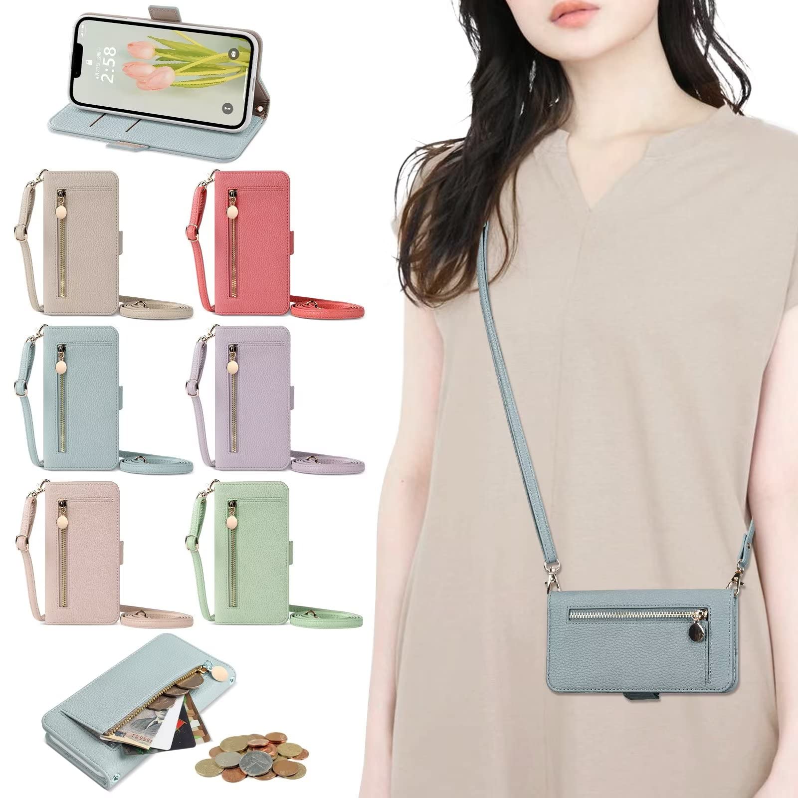 YerlyLan Кошелек для iPhone SE, iPhone SE Флип на молнии, Большая вместимость, Наплечная сумка для смартфона iPhone 8, Регулируемый плечевой ремень, Стильный для iPhone 7 синий