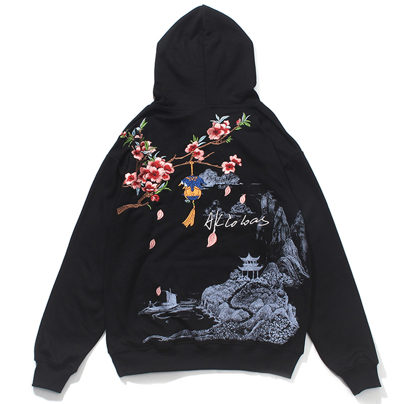 2021 New Hip Hop Streetwear Autumn Sweatshirt Hooded Pullover Japanese Sakura Embroidery Harajuku Hoodie Cotton Black Dzjo, White