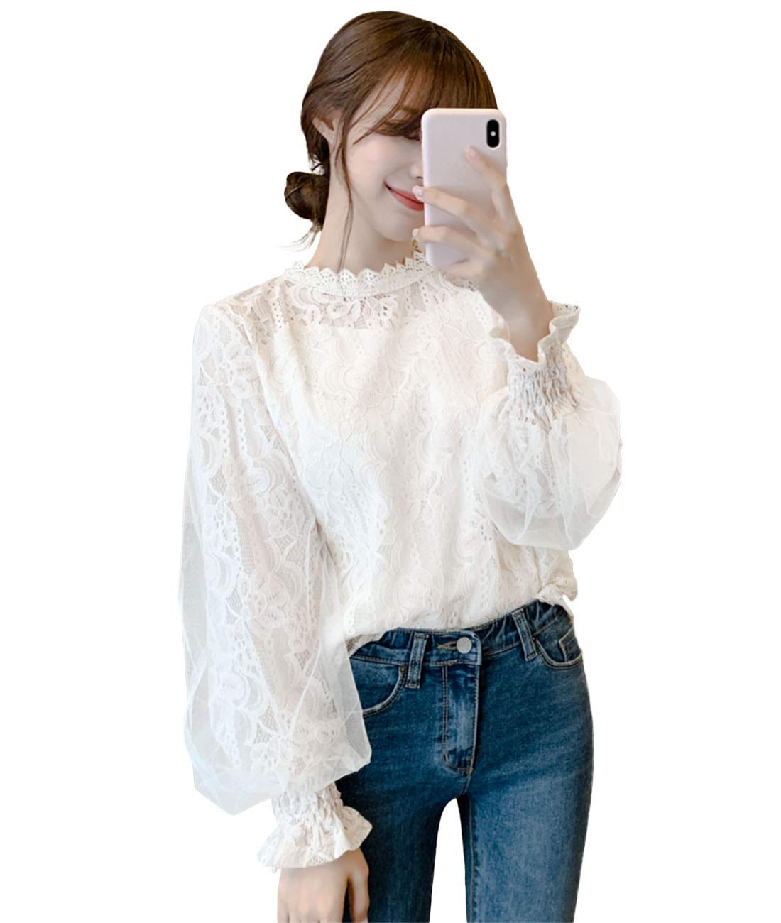 Yino Кружевная Блузка Тюль Длинная Осенняя Женская Блузка, Топ, Стильная, Милая, Стройнящая, Рукав, Формальная, Офисная, Для Поездок, Школьная, Элегантная, Повседневная, Дышащая, белый