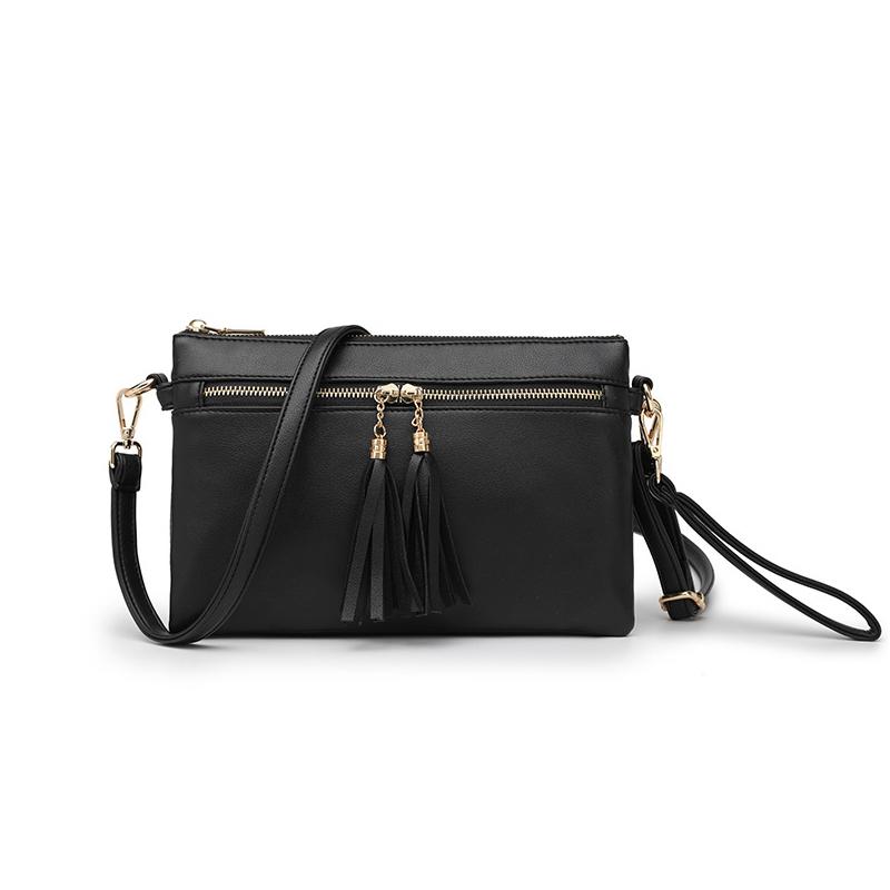 Yogodlns Женщины Прохладная Черная Искусственная Кожа Маленькая Сумка Через Плечо Винтажная Молния Многослойная Однотонная Кисточка Декор Сумка Через плечо