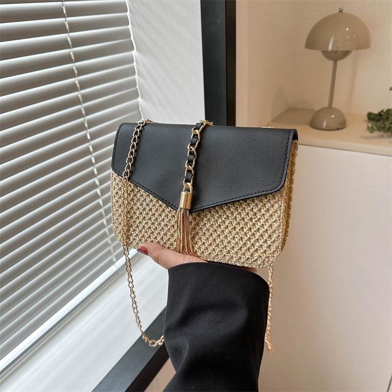 Yogodlns Модная солома + кожа маленькая сумочка с клапаном Женщины Летняя сумка через плечо из ротанга Тканая пляжная сумка ручной работы Сумка через плечо Bohemia Кисточка