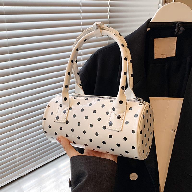Yogodlns Шикарная черно-белая в горошек Стильная цилиндрическая сумка кроссбоди Плетеная ручка Искусственная кожа Застежка-молния Универсальная сумка-мессенджер для женщин 21x10x10cm белый