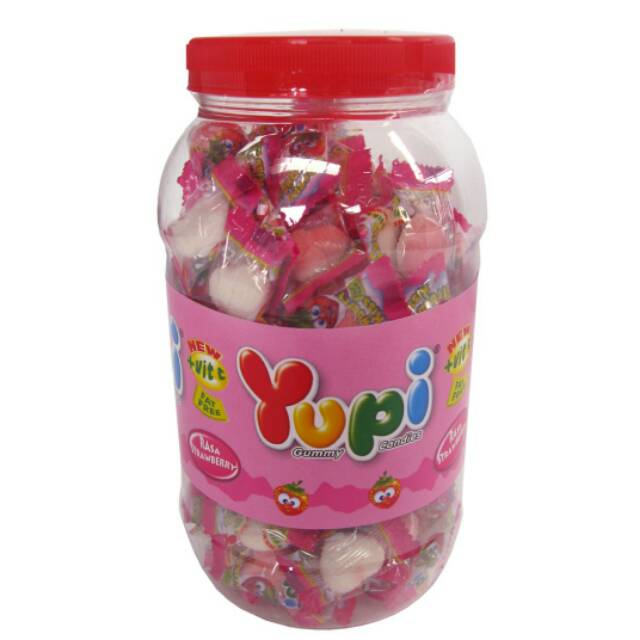 Yupi Strawberry Kiss kemasan praktis dalam toples tinggal sajikan d meja tamu