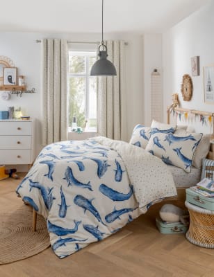 Bring a touch of the seaside to their room with this Mini Whales bedding set by Yvonne Ellen. It's crafted from a luxurious 200 thread count cotton blend with a smooth sateen finish. The hand-painted design has majestic whales on one side and a magical star print on the reverse - both sides featuring premium piped trims.