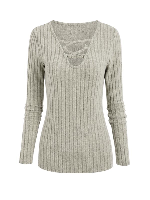 ZAFUL Женская плюшевая пушистая трикотажная решетчатая футболка с V-образным вырезом и длинным рукавом L серый
