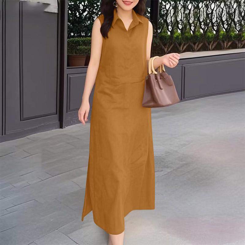 ZANZEA Женское летнее платье-рубашка без рукавов с отложным воротником коричневый