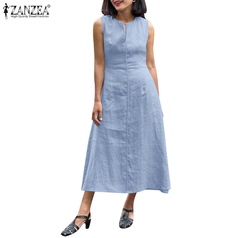 ZANZEA Женское летнее повседневное платье трапециевидной формы без рукавов с круглым вырезом