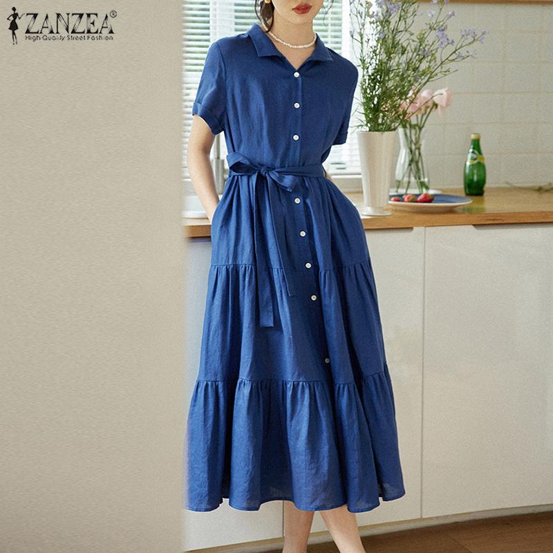 ZANZEA Женское летнее повседневное свободное длинное платье с отложным воротником и коротким рукавом