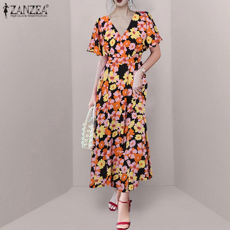 ZANZEA Женское повседневное летнее длинное платье с v-образным вырезом и коротким рукавом с цветочным принтом