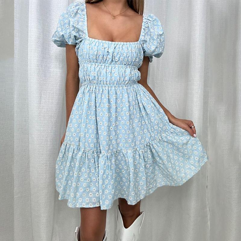 ZANZEA Летнее женское повседневное мини-платье с пышными рукавами и тонкой талией, с цветочным принтом, праздничное, плиссированное S синий