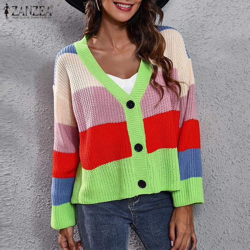 ZANZEA Осень Весна Женские С V-образным вырезом Длинный рукав Красочная полоска Повседневные Свитера Кардиганы Трикотаж S зелёный
