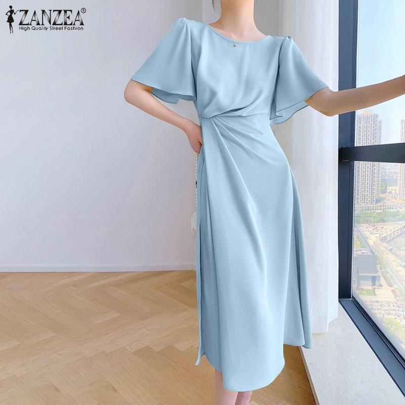 ZANZEA женские летние свободные платья с круглым вырезом и листом лотоса, короткими рукавами, плиссированные, со сборной талией