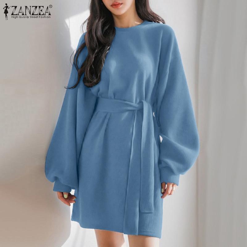 ZANZEA женский круглый вырез с заниженной талией, пояс с длинными рукавами, свободные однотонные элегантные платья на талии