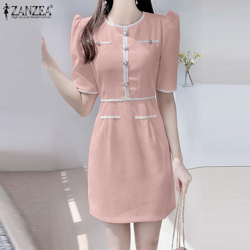 ZANZEA женское летнее короткое платье с круглым вырезом и коротким рукавом контрастного цвета с кружевной талией
