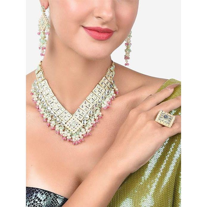 ZAVERI PEARLS зеленые розовые камни и кластерные бусины Kundan, ожерелье, серьги и кольца, комплект для женщин