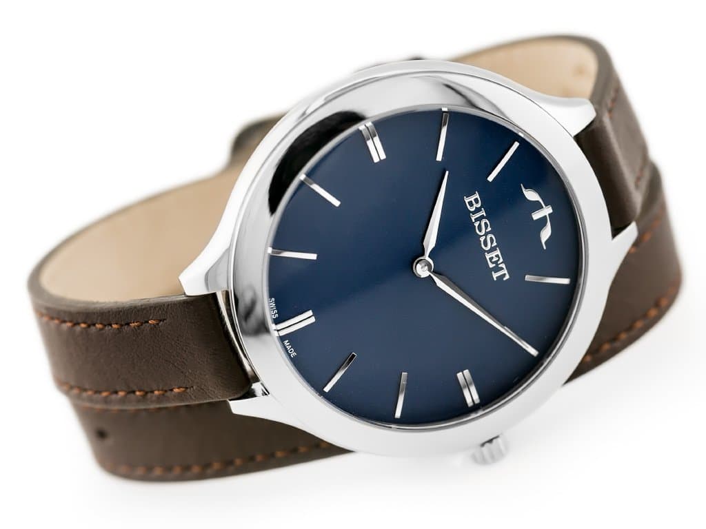 WYMIARY:koperta: 41 x 45 x 6mmtarcza: 34mmszerokość paska: 12/11mmdługość całości: ok. 422mmMechanizm: RONDA SWISSKoperta stalowa, pasek skórzanyKolorystyka: Tarcza w kolorze niebieskim, koperta w kolorze srebrnym, pasek w kolorze brązowym, indeks w kolorze srebrnymGwarancja producenta: 24m-ce