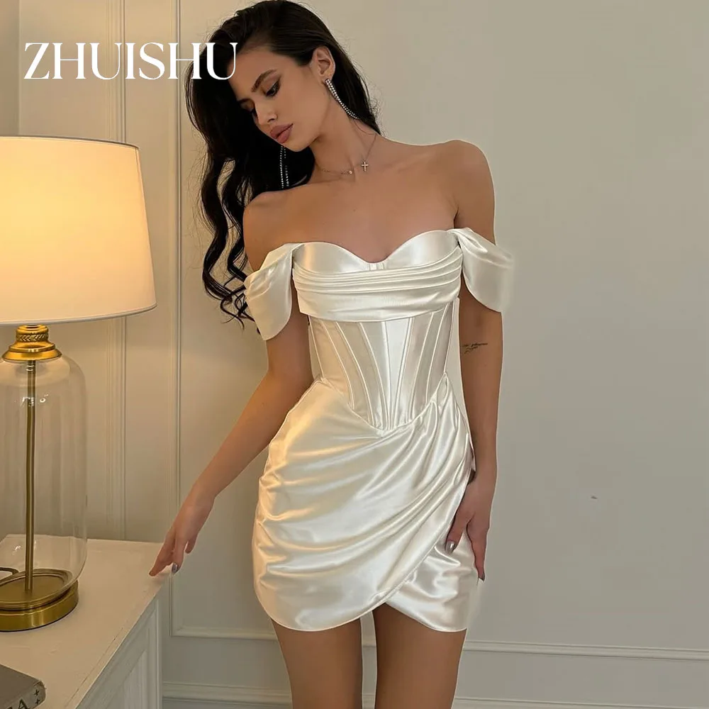 ZHUISHU Шелковое атласное мини-платье для свадебной вечеринки с открытыми плечами Короткое свадебное платье трапециевидной формы для выпускного вечера невесты 2026 Вечернее платье