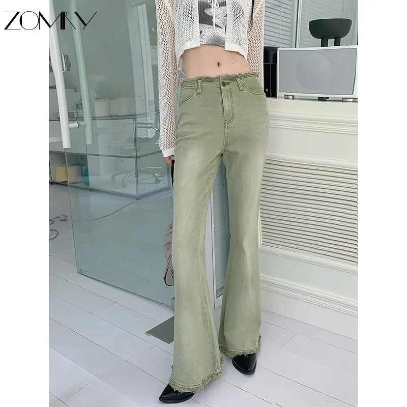 ZOMRY Высокие эластичные расклешенные джинсы с низкой талией в американском стиле ретро, с необработанными краями, удобные брюки для мытья полов, удобная универсальная уличная одежда для женщин