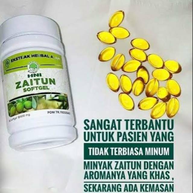 Zaitun Softgel. Hasil ekstraksi pertama dari buah Zaitun yang dikonsumsi sebagai sumber minyak nabati, untuk meningkatkan imunitas, mencegah radikal bebas dan Dapat mengurangi resiko penyakit jantung, pembuluh darah, kanker, serta alzheimer. Dikemas dalam bentuk softgel memudahkan untuk dikonsumsi.