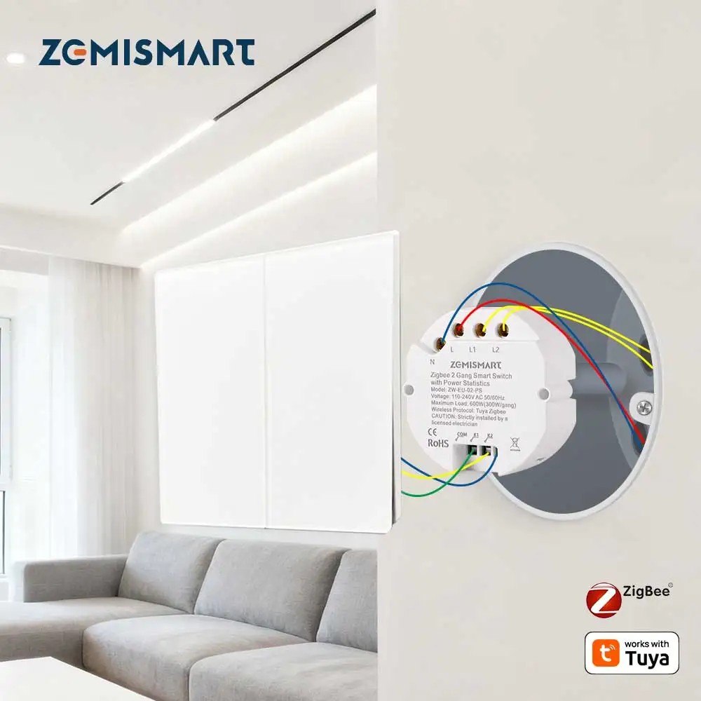 Zemismart Zigbee 2 Gang Smart Inline Module Mini Light Switch with Power Statistics Function Work with Tuya Smart Life App