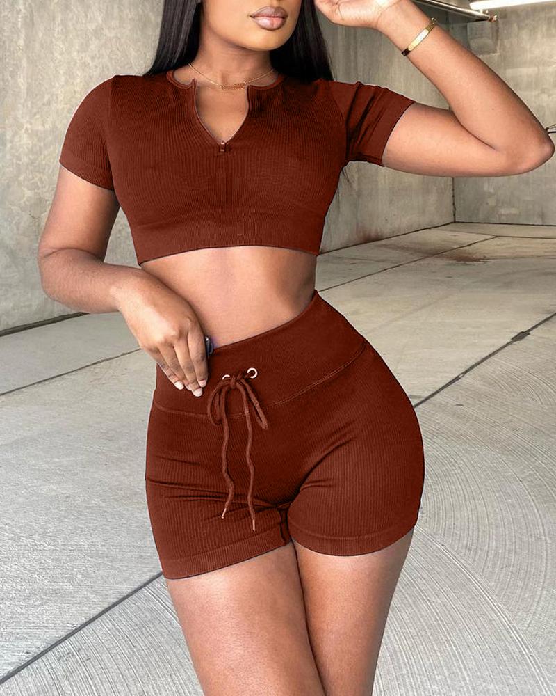 Zip Front Ribbed Crop Top & Drawstring Shorts Set, Brown
