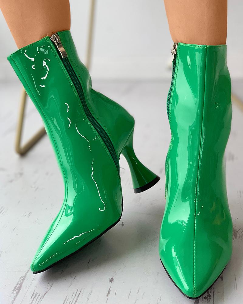 Zipper Design Pointed Toe Pyramid Heeled Boots, Green