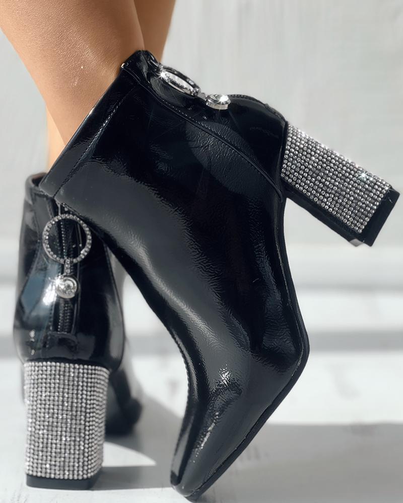 Zipper Design Rhinestone Chunky Heel Martin Boots, Black