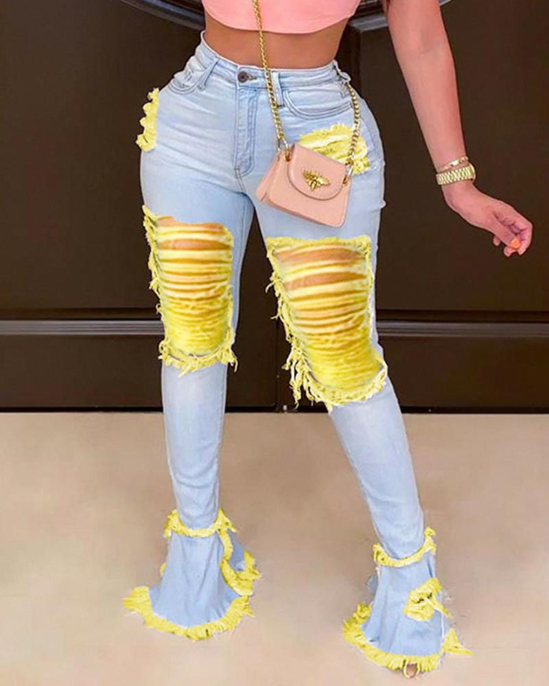 Zipper Fly Fringe Ruffle Hem Ripped Skinny Jeans, Blue