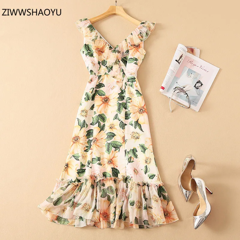 Ziwwshaoyu 2021 модное женское летнее платье-трапеция из шифона и хлопка с цветочным принтом без рукавов Элегантные платья до колена на молнии с V-о...