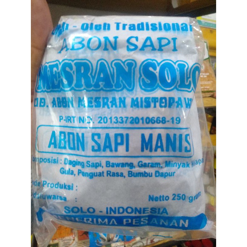 abon sapi mesran merupakan abon legendaris dari solo, terbuat dari bumbu pilihan dan daging pilihan. terdiri dari dua pilihan rasa manis dan pedas
