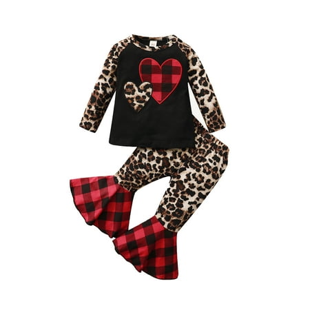 Canrulo Toddler Baby Girls Heart Plaids T-Shirts Tops Leopard Flared Bell Bottom Pants 2PCS Outfits Clothes Red 4-5 Years