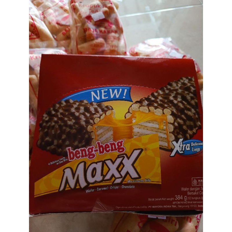 beng beng maxx maximum bite/extra delicius long.. wafer-caramel-crispy-chocolate.. dengan varian yg lbh besar dan tebal membuat cita rasa beng2 semakin sulit untuk di lupakn bagi peminatny.. harga tersebut untuk 1box isi 12pcs