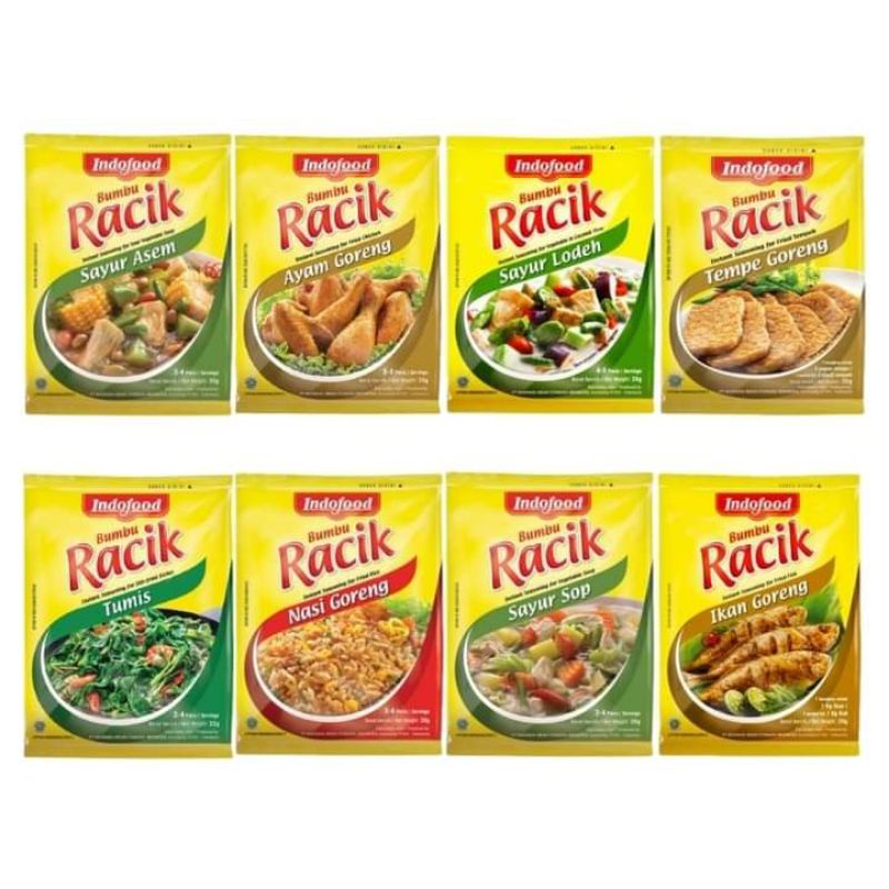 Indofood Bumbu Racik Instant Sayur Asem, Sayur Tumis, ayam goreng,ikan goreng dan Sayur Sop yang terbuat dari racikan bumbu yang berkualitas cocok banget dengan selera Idonesia.