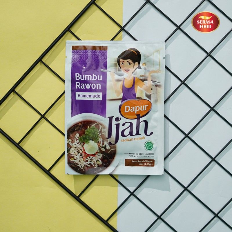 Dapur Ijah - Bumbu Rawon Bumbu Rawon instant yang dibuat dari bahan-bahan pilihan membuat masakan anda khususnya Rawon menjadi lebih sedap, harum, dan enak pastinya. Berat : 50gr Komposisi : Cabai, bawang merah, bawang putih, terasi, kluwek, jahe, kunyit, serai, garam, minyak goreng Expired : 1 tahun Cara membuat : Tumis bumbu dan daun jeruk sampai harum. Masukkan 250 gr daging sambil diaduk, kemudian tambahkan air ± 250 cc, masak hingga mendidih dengan api sedang, lalu masak hingga daging lunak dan air kaldu sesuai selera, tambah garam sesuai selera. Angkat dan siap untuk dihidangkan, taburi bawang goreng. Harga Jual Dapur Ijah - Bumbu Rawon - Rp 5.900